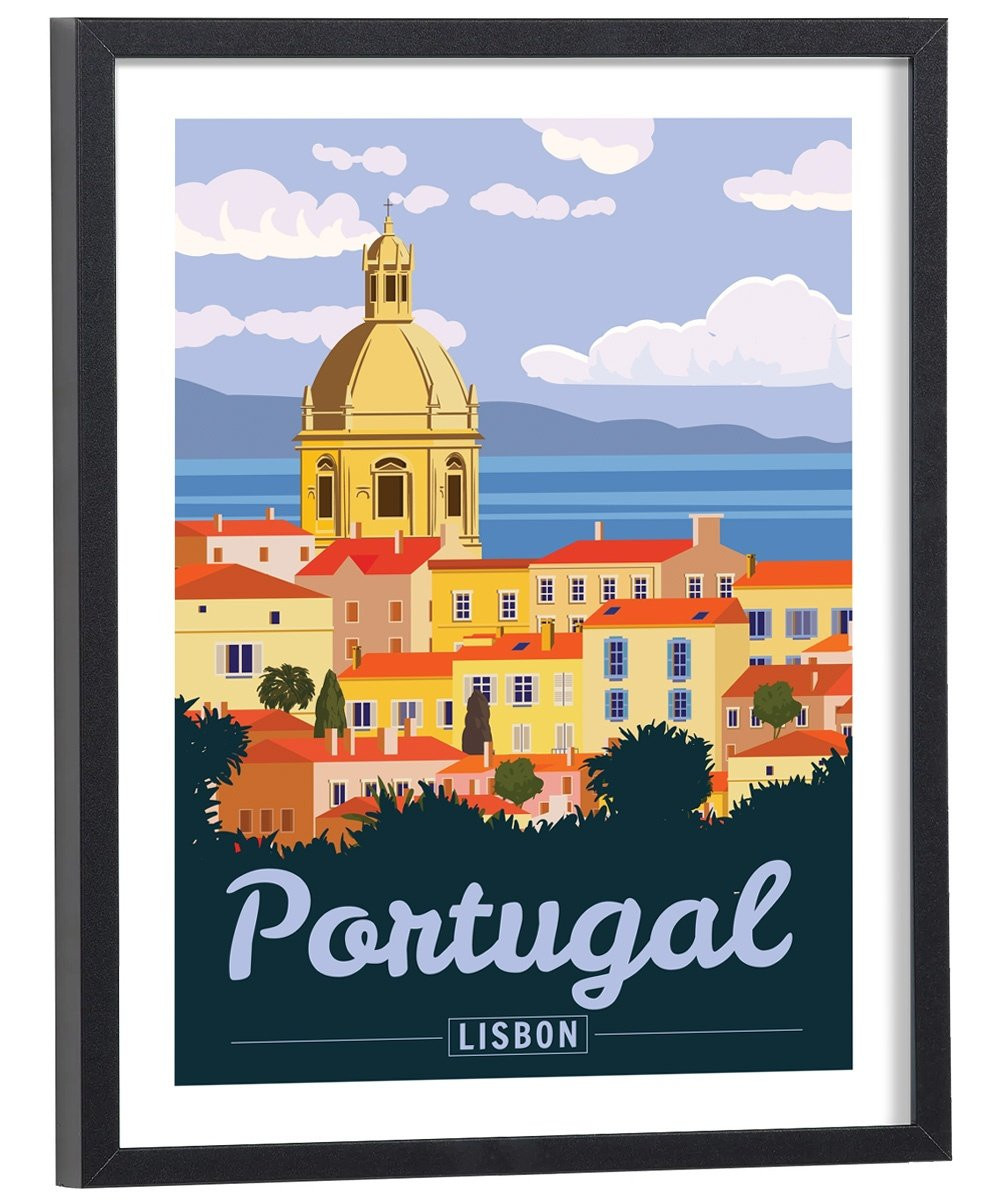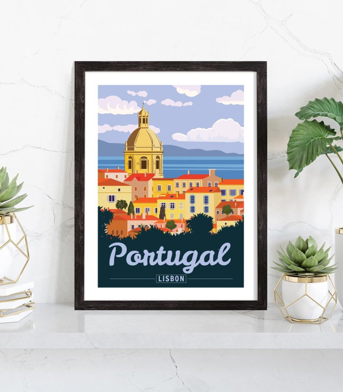 Affiche vintage du Portugal avec une vue sur la ville de Lisbonne. Cette affiche vintage du Portugal est vendue avec l'encadrement.