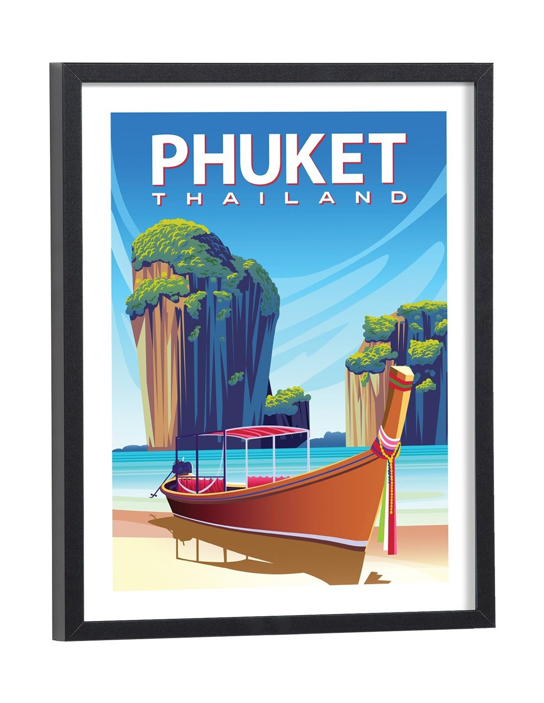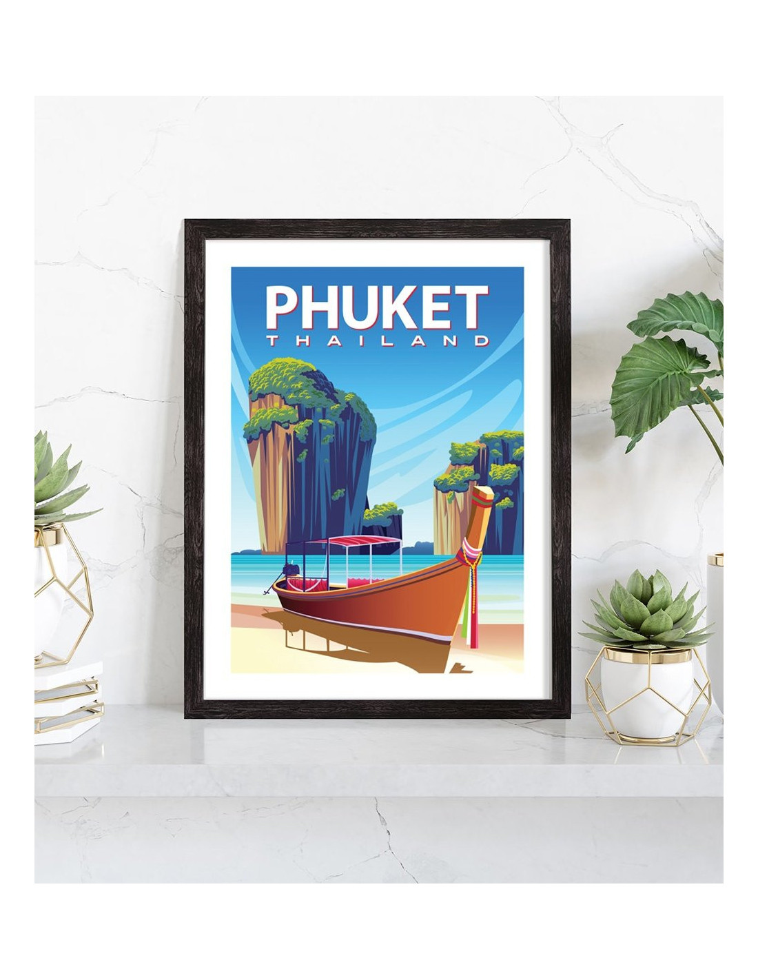 Affiche vintage de l'île de Phuket en Thaïlande. Cette affiche vintage et colorée du Phuket en Thaïlande est vendue avec l'encadrement.