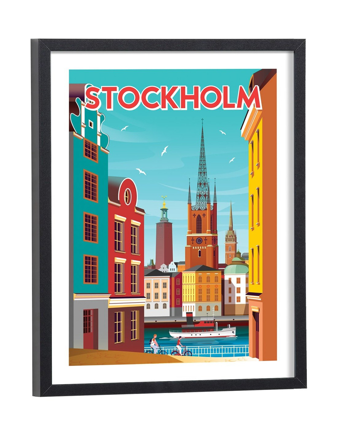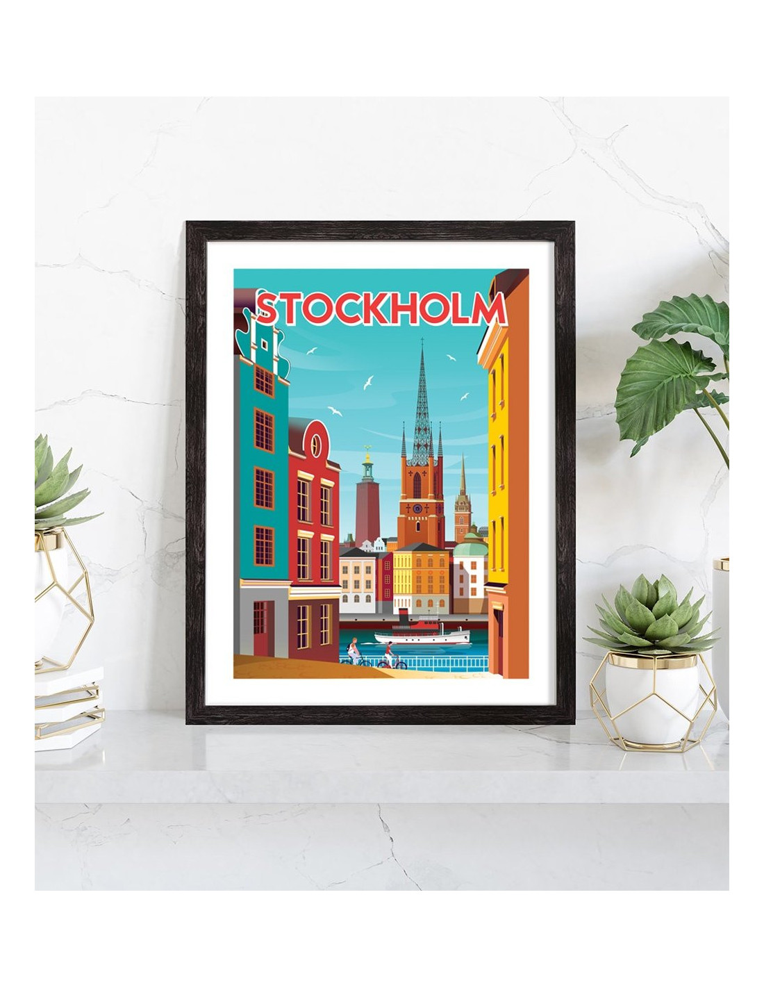 Affiche vintage de la ville de Stockholm, capitale de la Suède. Cette affiche vintage de Stockholm est vendue avec l'encadrement.
