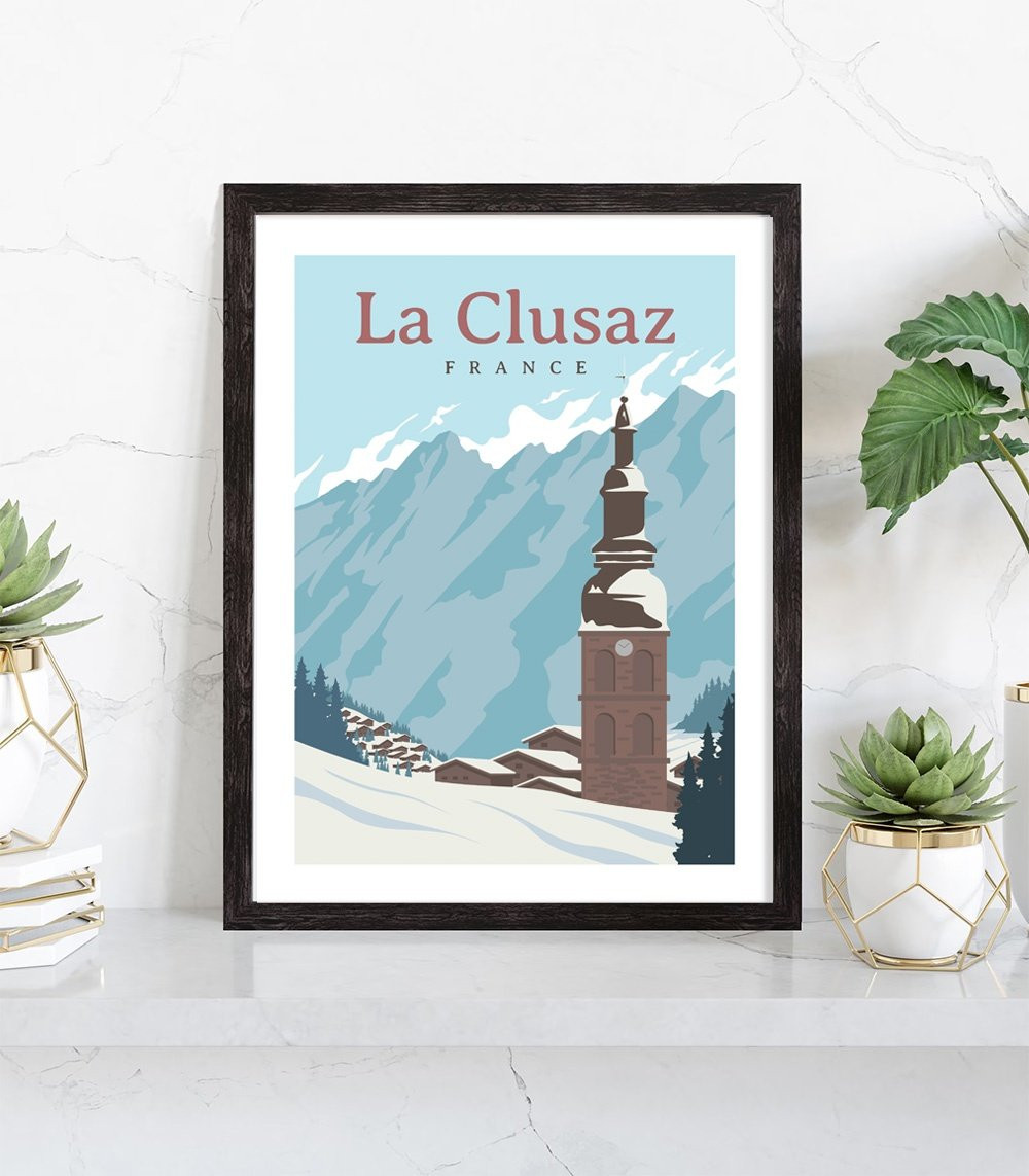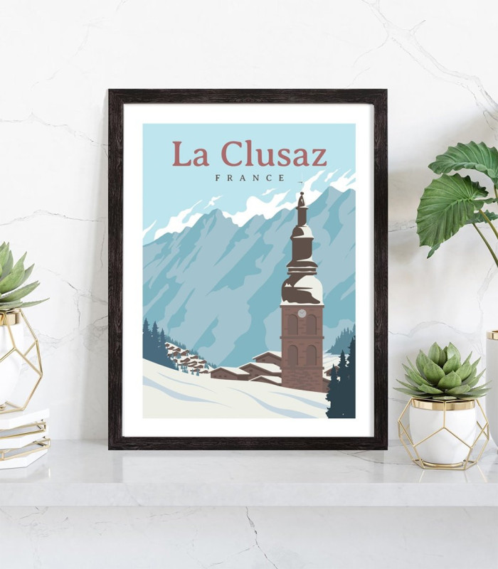 Affiche vintage de la ville de La Clusaz située en Haute Savoie. Cette affiche vintage de paysage de montagne est vendue avec l'encadrement.