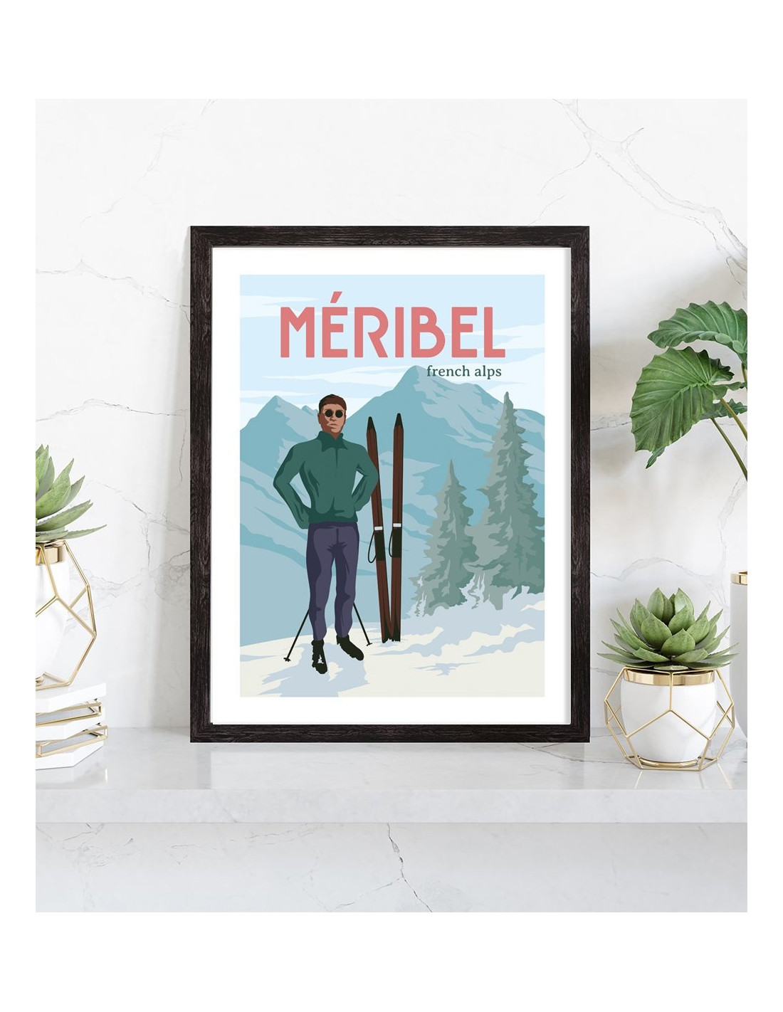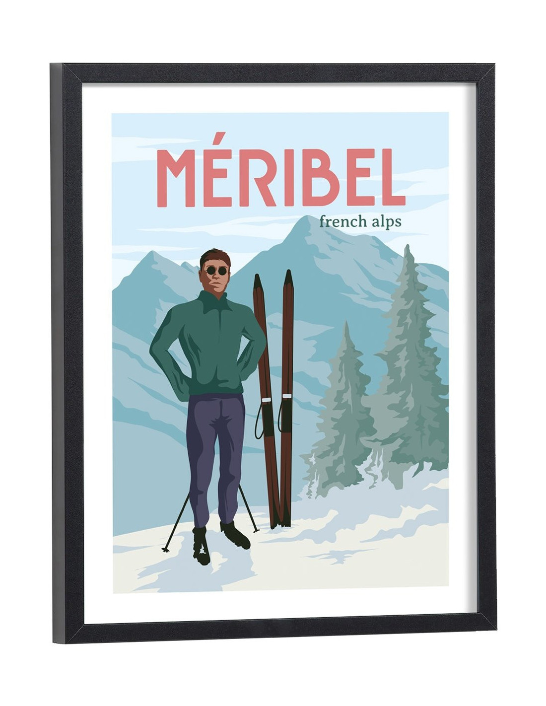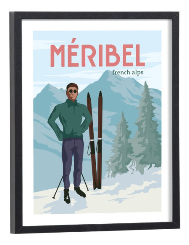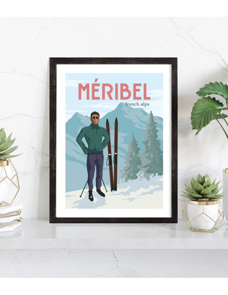 Affiche vintage de la station de ski de Méribel avec un skieur et la montagne en arrière plan. Cette affiche vintage de Méribel est vendue avec l'encadrement.