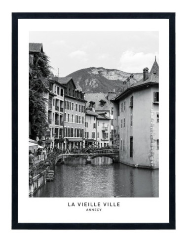 Tableau décoration noir et blanc de la ville d'Annecy, avec la vieil Annecy et sa ville fortifiée.