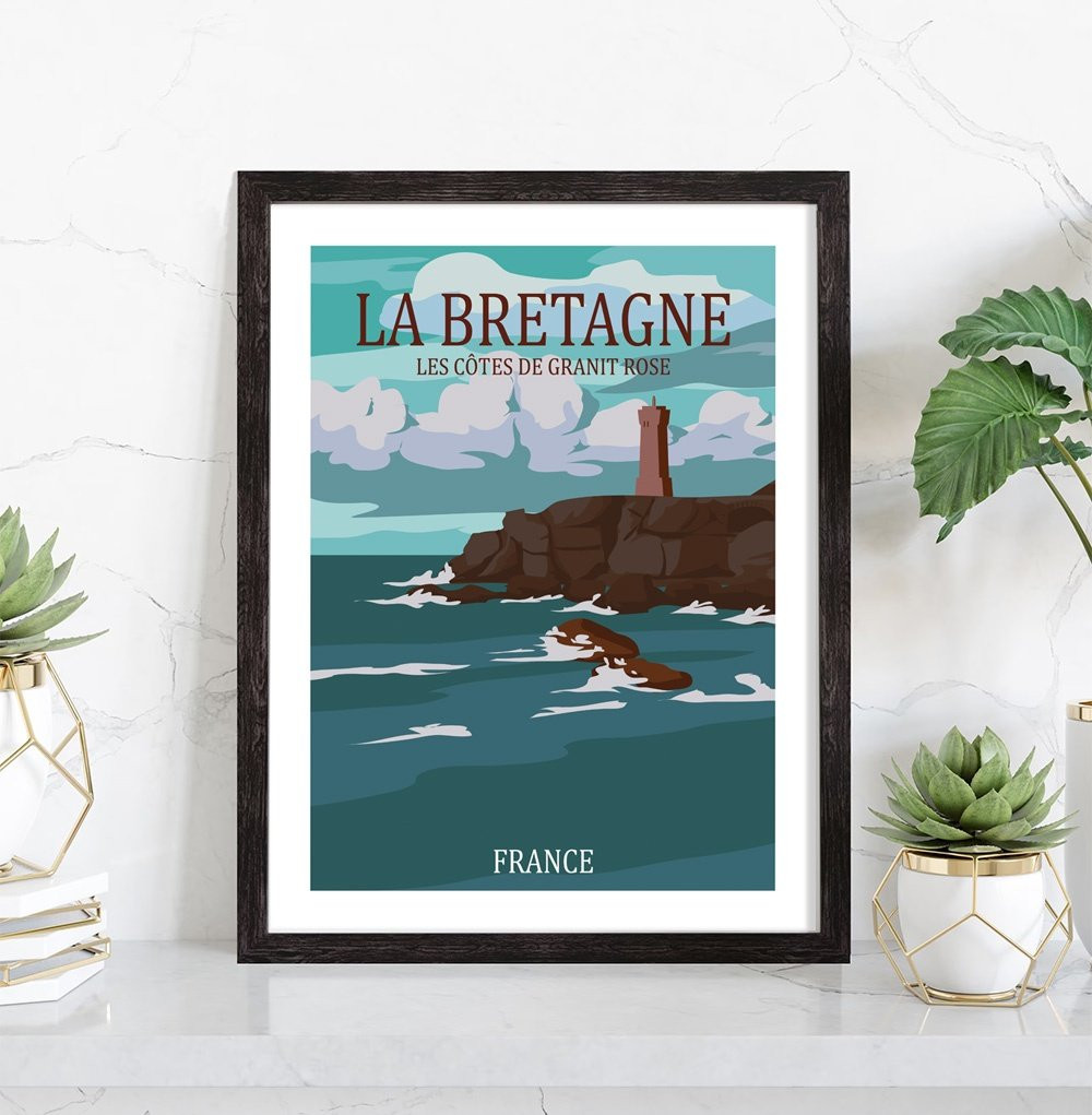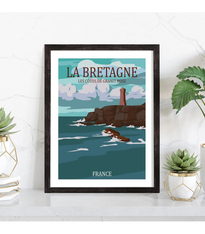 Tableau décoration vintage de la Bretagne. Découvrez cette magnifique affiche de la côte de granit roses, située dans le nord de la Bretagne. Craquez pour cette affiche vintage de la Bretagne.