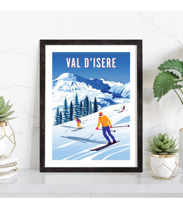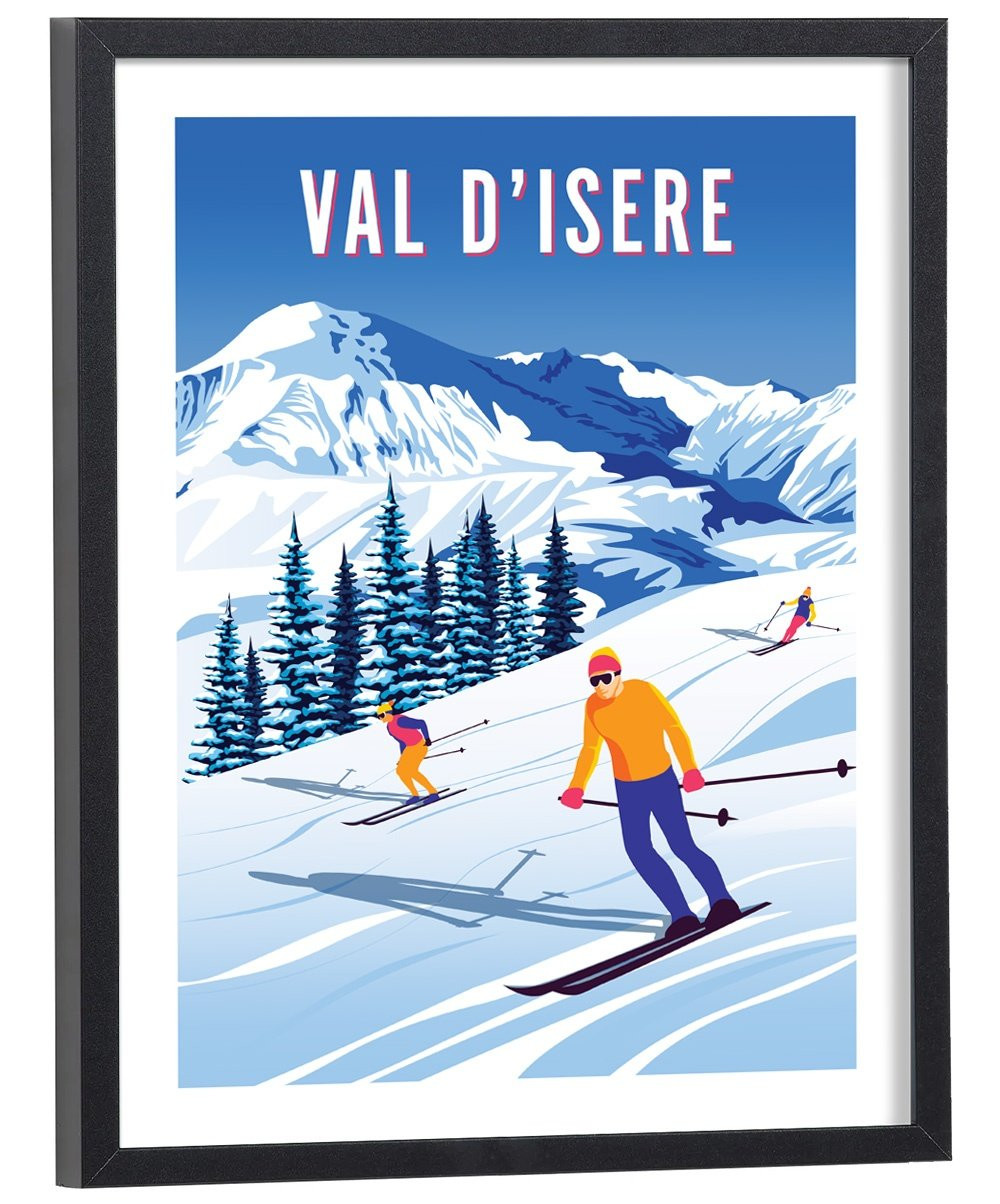 Tableau de décoration vintage du Val d'Isère avec ses stations de ski et les montagnes sous la neige en hiver.