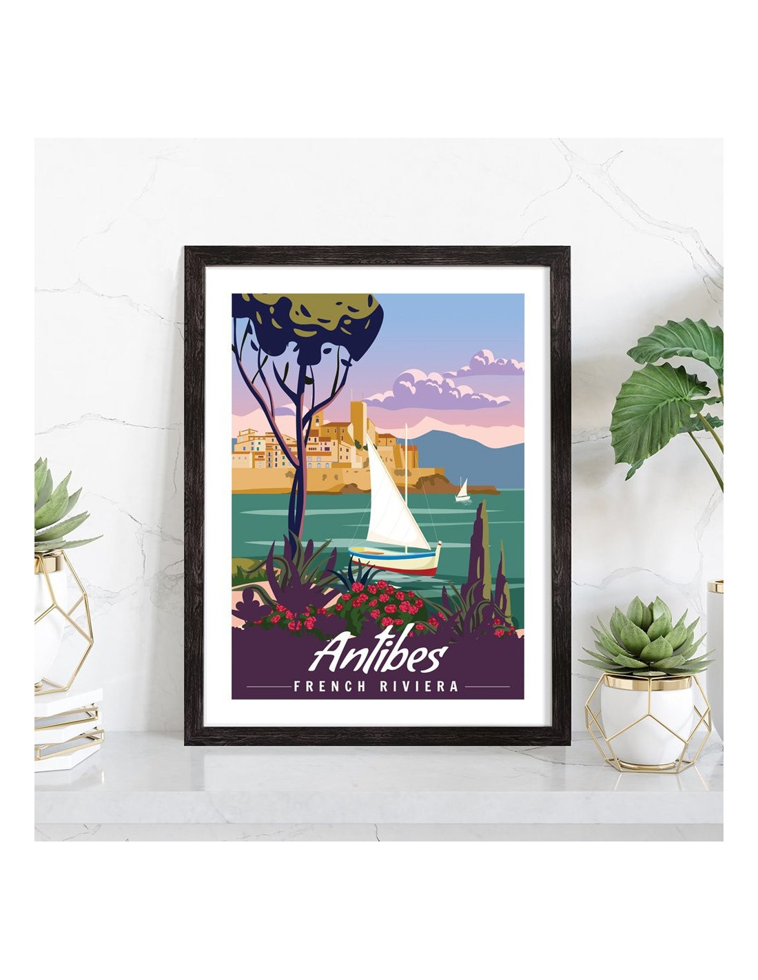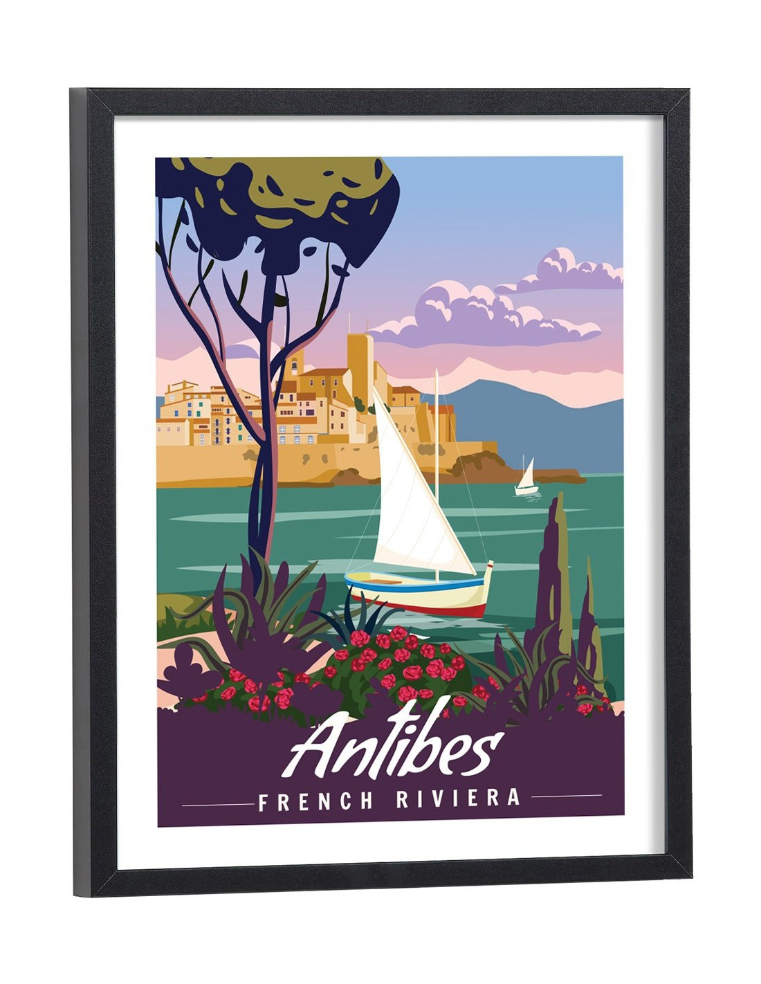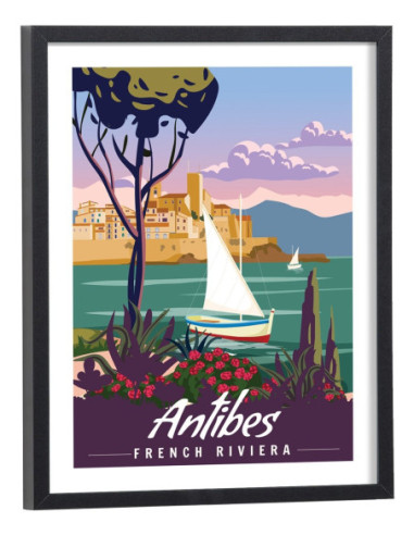 Tableau décoration vintage de la ville d'Antibes. Cette affiche vintage de la côte d'Azur est vendue avec l'encadrement.
