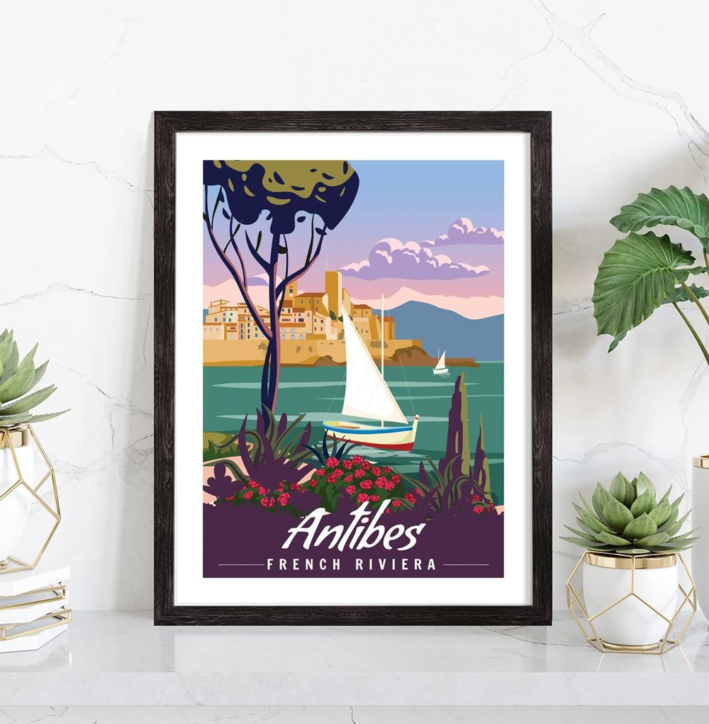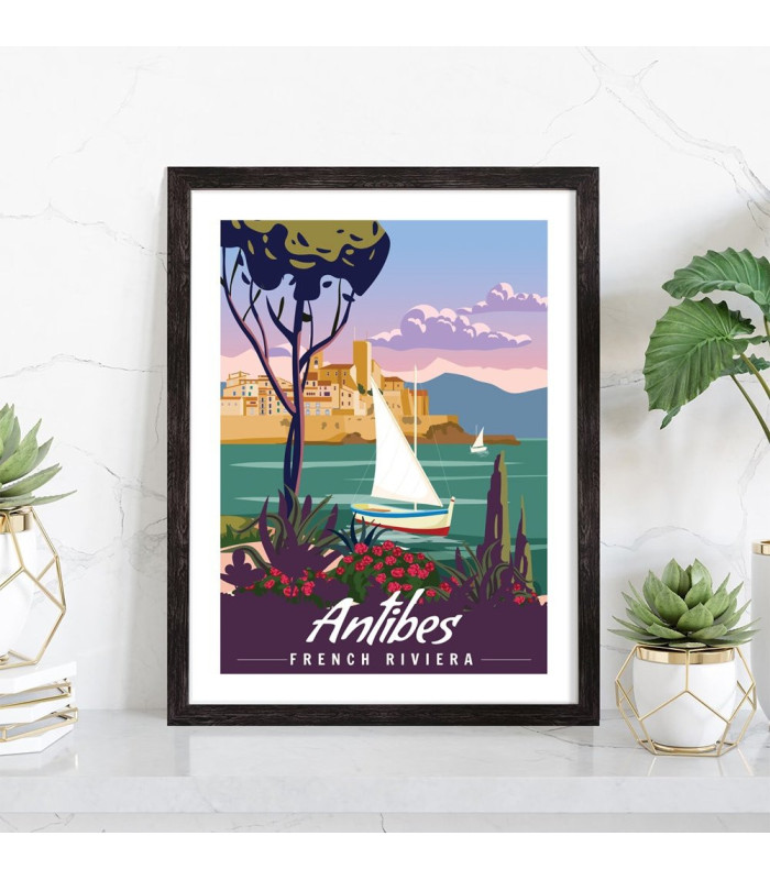 Tableau décoration vintage de la ville d'Antibes. Cette affiche vintage de la côte d'Azur est vendue avec l'encadrement.