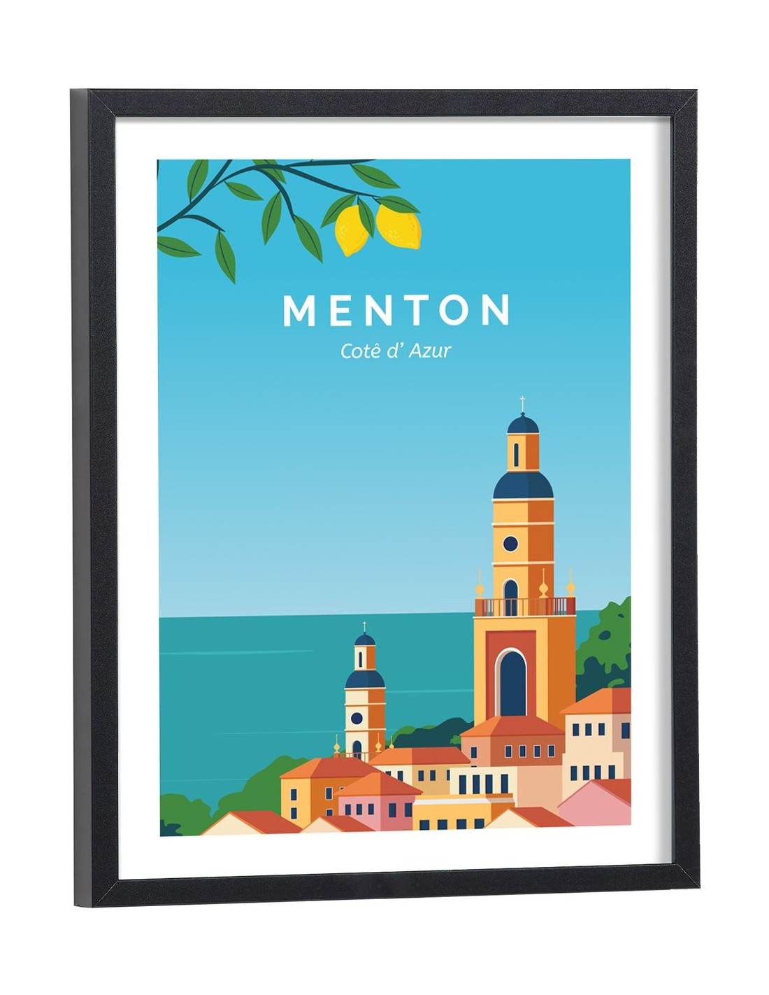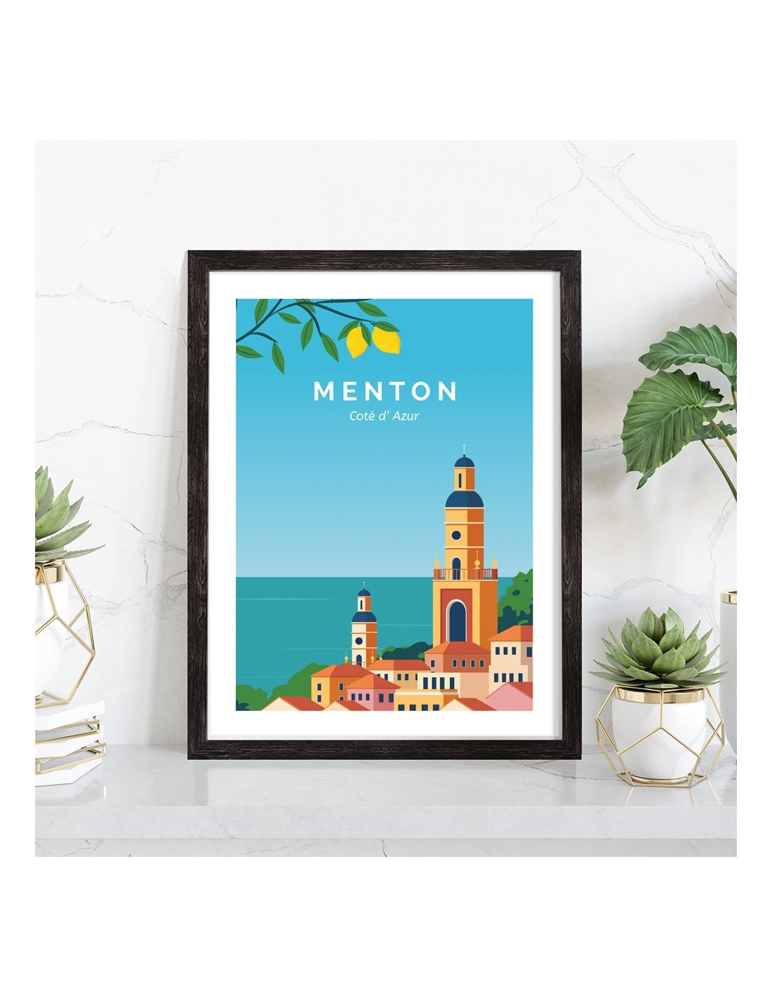 Tableau décoration vintage de la ville de Menton. Cette affiche vintage de Menton est vendue avec l'encadrement.
