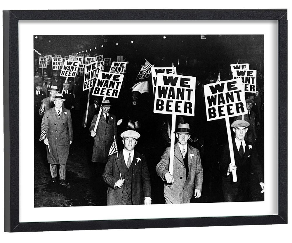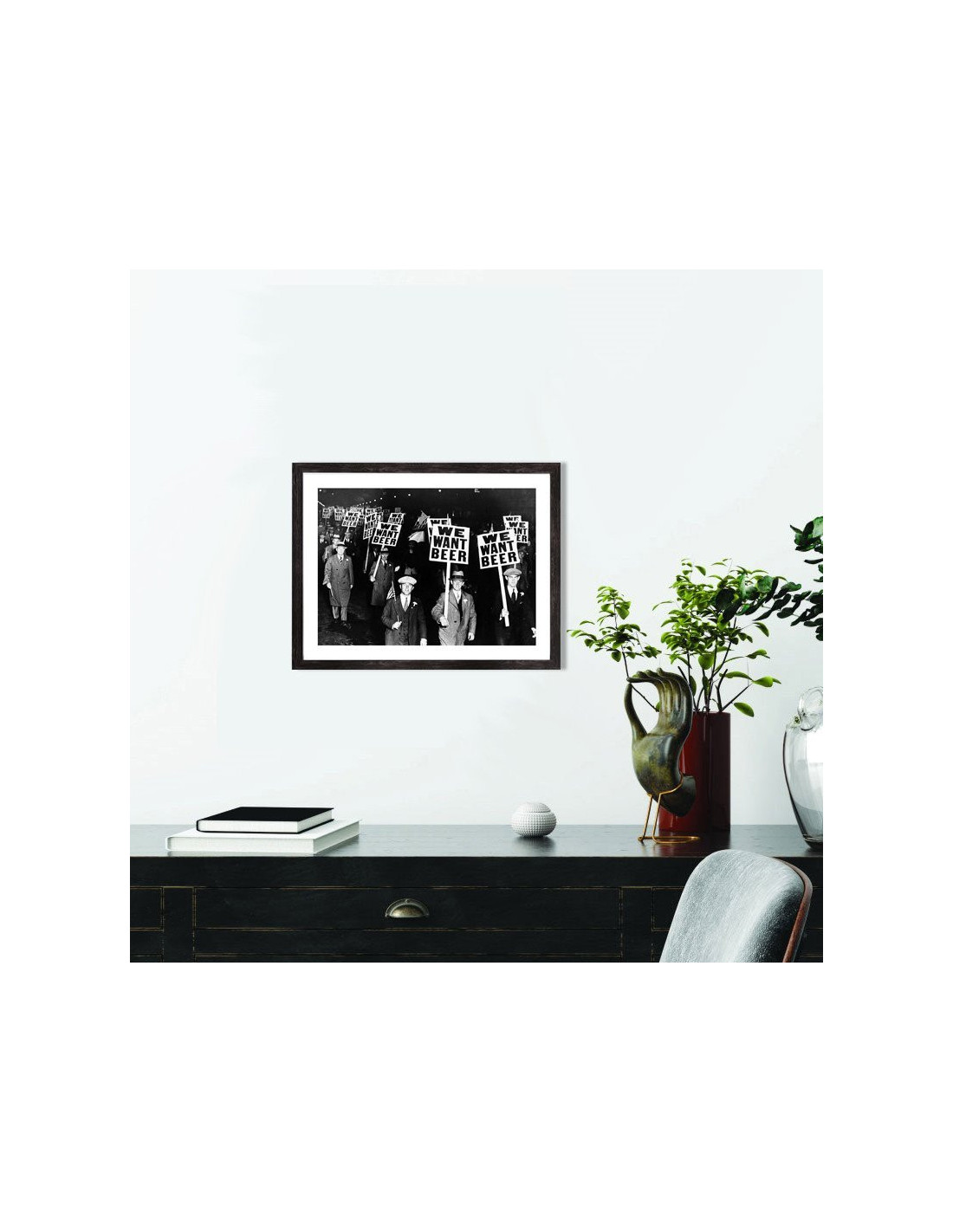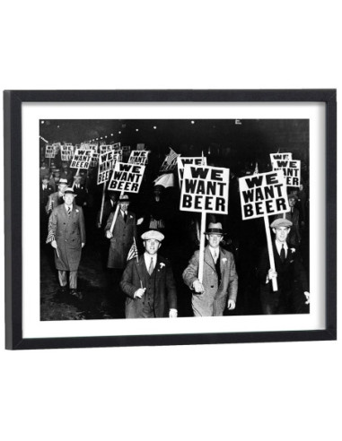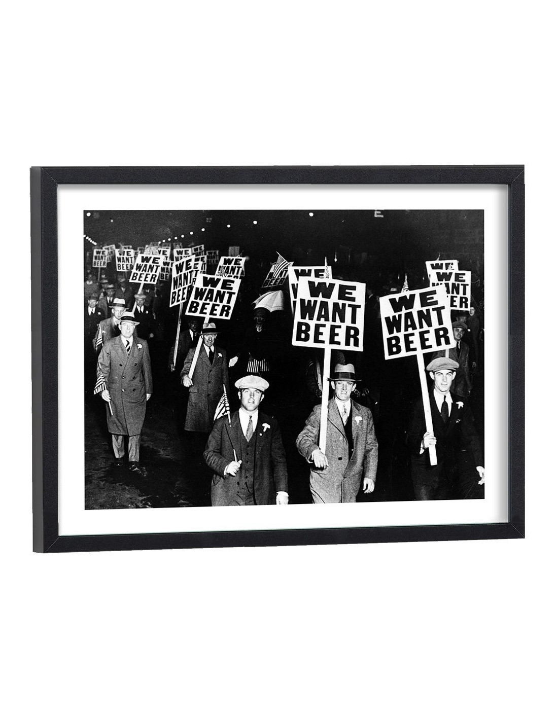 Tableau vintage noir et blanc "We want beer". Manifestation pendant la prohibition, période pendant laquelle l’alcool a été rendu illégal aux Etats-Unis entre 1919 et 1933.
