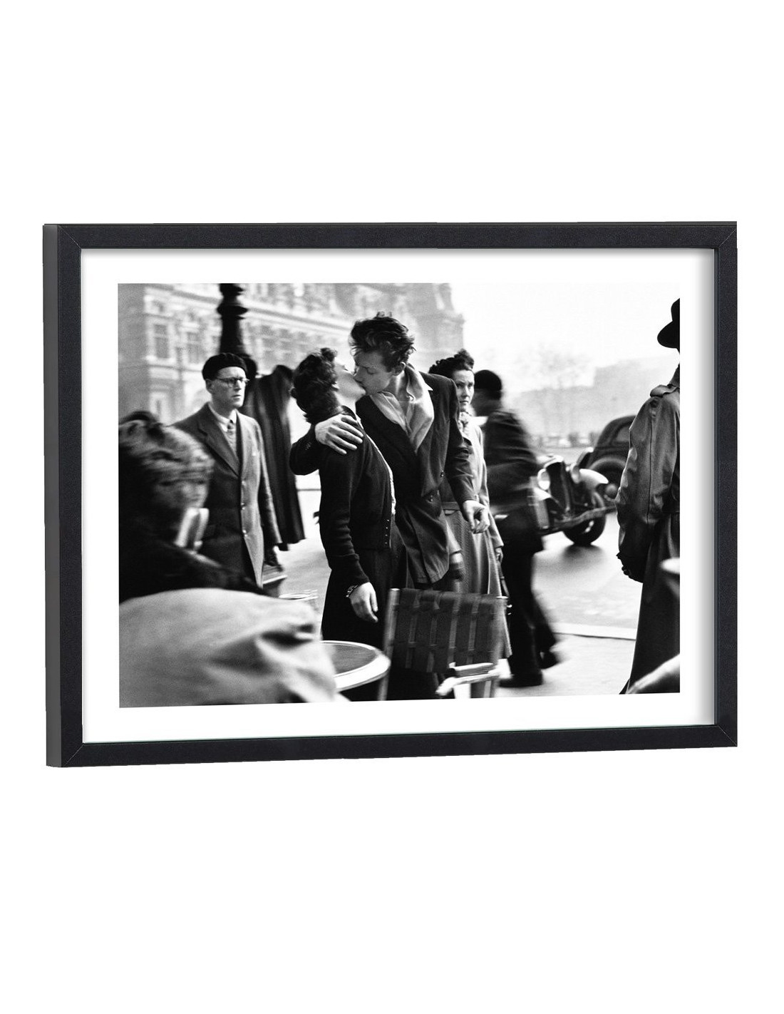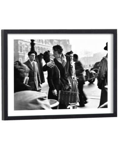 Sur cette photo en noir et blanc célèbre du photographe français Robert Doisneau, un homme et une femme s'embrassent tout en marchant sur le trottoir. On y voit des passants en train de marcher sans se soucier des amoureux qui s'embrassent. Cette photo a été prise en 1950 près de l'hôtel de ville de Paris. Robert Doisneau a passé sa carrière à photographier des scènes de vie dans Paris. Cette photo a été publiée pour la première fois dans le magazine Life. C'est l'une des plus célèbre photographie au monde. Cette affiche décorera parfaitement votre salon ou votre bureau.